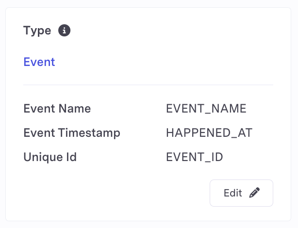 | Event Timestamp | A column that contains the timestamp the event occurred (ideally in UTC). Only available on the Event dataset, for which it's required.Event timestamp unlocks the use of advanced event specific Segmentation as well as Metric tracking for Segmentation Experiments. |