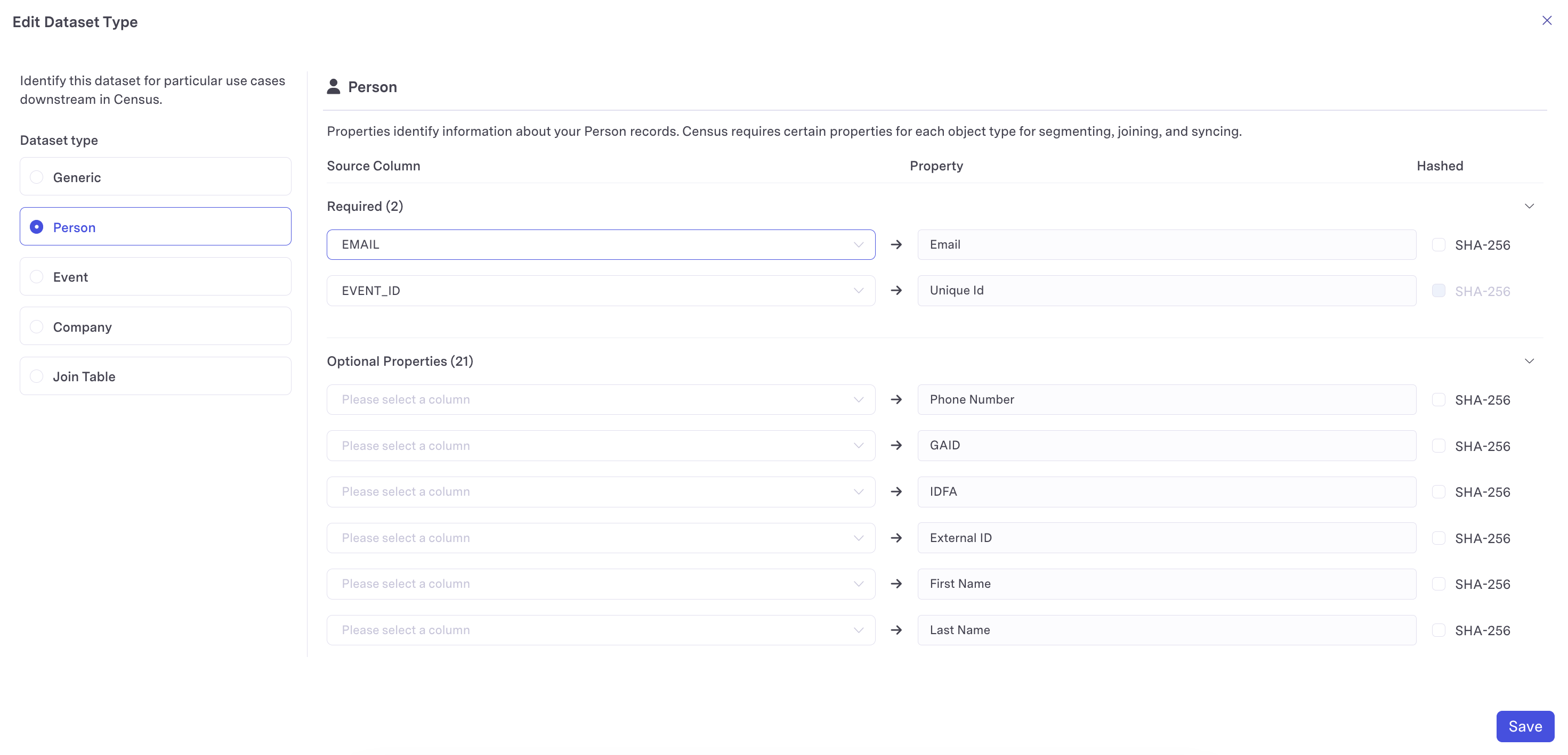 Dataset Types go hand in hand with Dataset Property Mappings. Property Mappings allow you to highlight key columns that also represent universal concepts, such as email, and carry special implications. There are several property mappings supported for each Dataset Type.