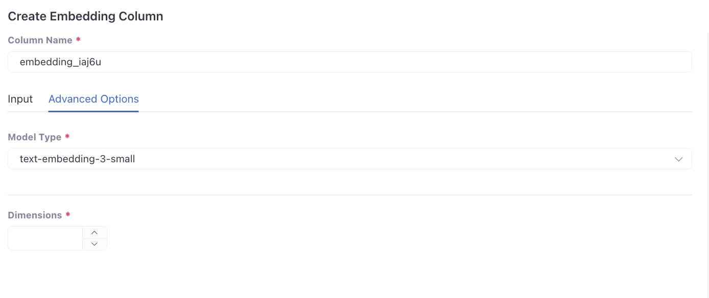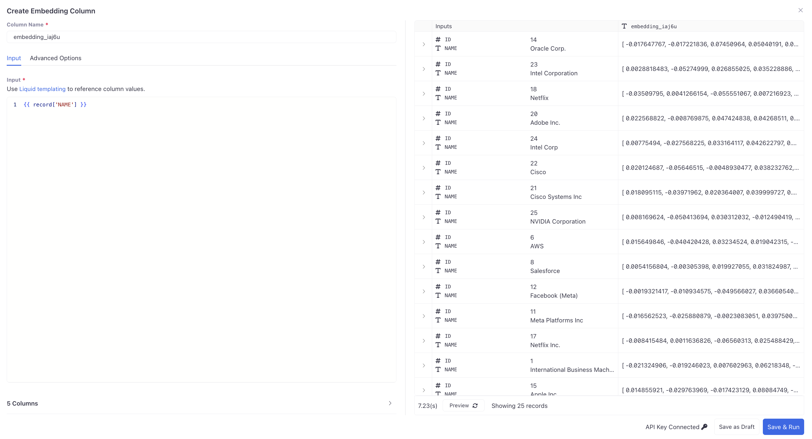 Embedding Columns enable you to generate vector embeddings for each row in your dataset using ChatGPT (OpenAI) or Gemini (Google). Select the column in your dataset you'd like to generate embeddings for, or use liquid templating to combine columns together. This setup allows you to generate text input for each row, with the embedding automatically written back to your Embedding Column.