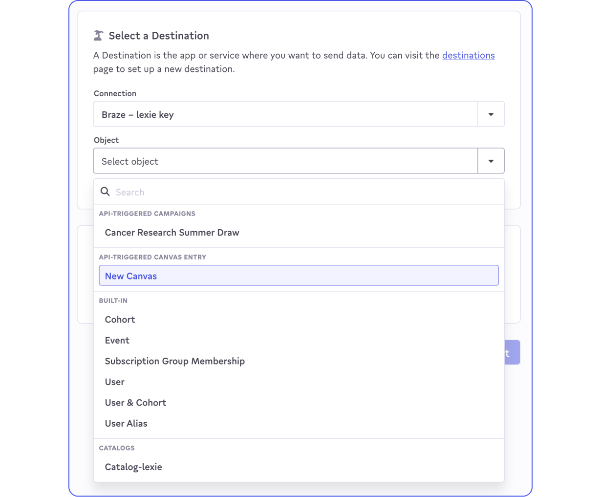 API Triggered Campaign and Canvas Entries are useful for triggering transactional actions within Braze. Like Catalogs, you will need to create the Campaign/Canvas Entry in Braze first before it appears as a destination object in Activations.