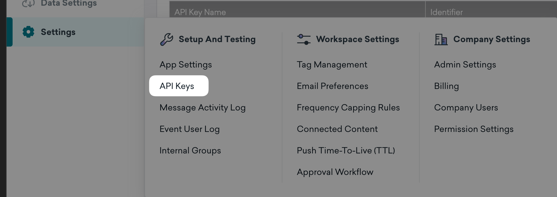 Within Braze's left navigation bar, scroll down to the very bottom. In the Settings tabs, under the subheading Setup And Testing, click API Keys.