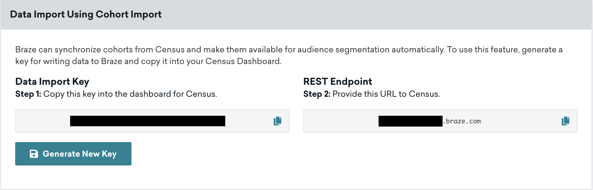 Braze Cohorts allow users of Activations to define and sync user cohorts between Activations and Braze. To get started make sure your data import key is set on the connection. Then when creating a new sync to Braze select User & Cohort as destination object.