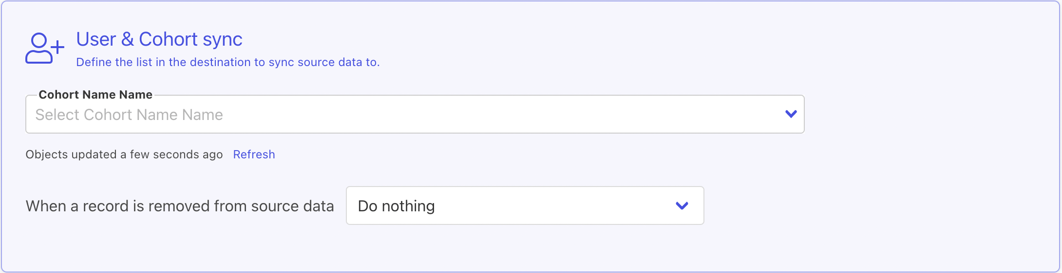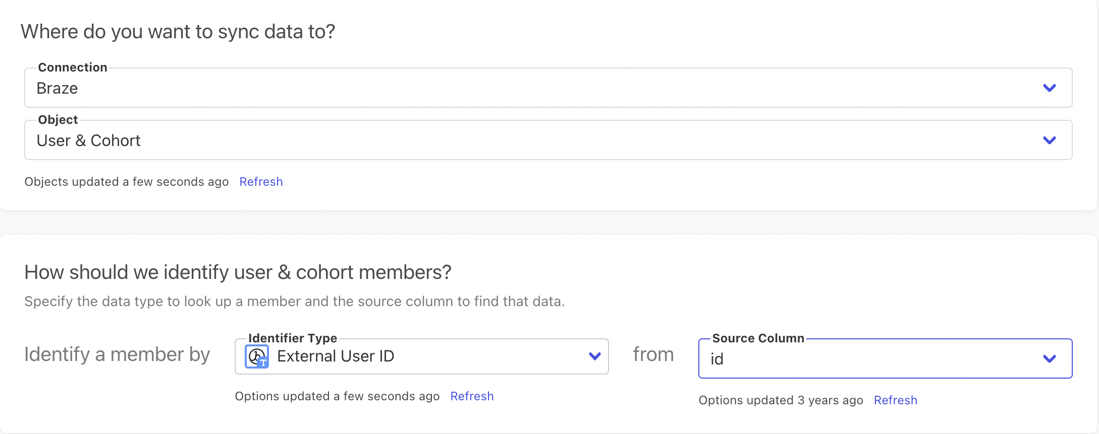 Select the source column for identifying users that you want to add to a Cohort. Right now we can only identify Braze users for Cohorts by External User ID. Then select what Cohort you would like to sync to. You can select an existing Cohort from the dropdown list, define a new Cohort, or select a source column to dynamically get the Cohort name value.