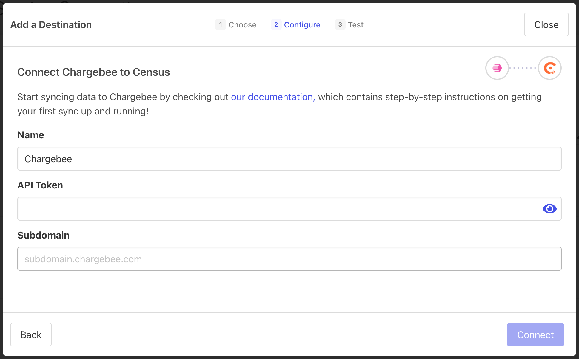Activations needs only your Chargebee API token and sub domain to connect you to your Chargebee instance.