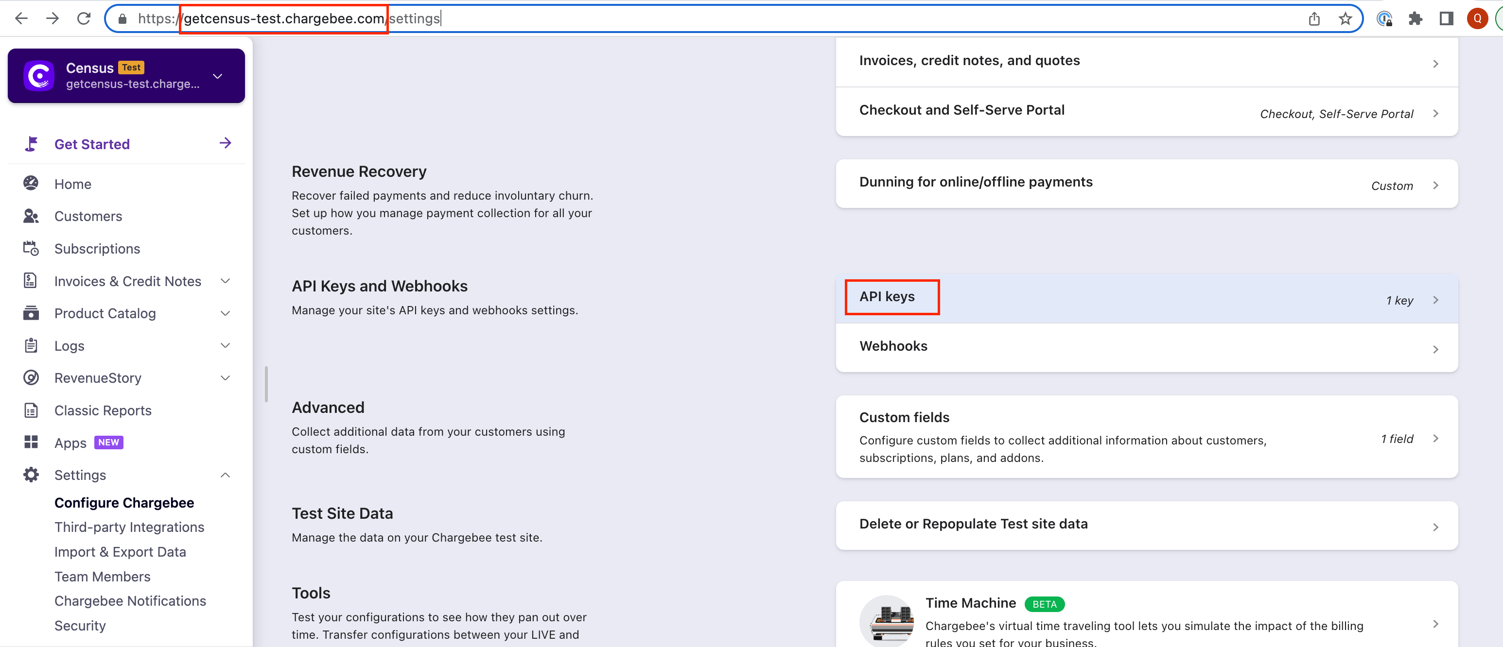 - The API token can be found in your Chargebee Settings under Configure Chargebee