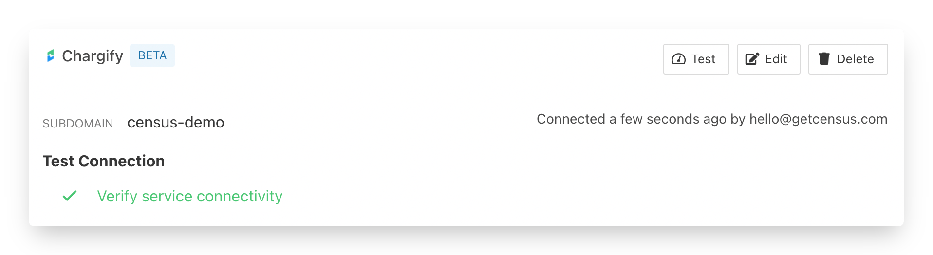 - Paste your Chargify site's API Key and Subdomain. Save your connection and if everything is set up correctly, you should see a successful connection which should look something like this 👇