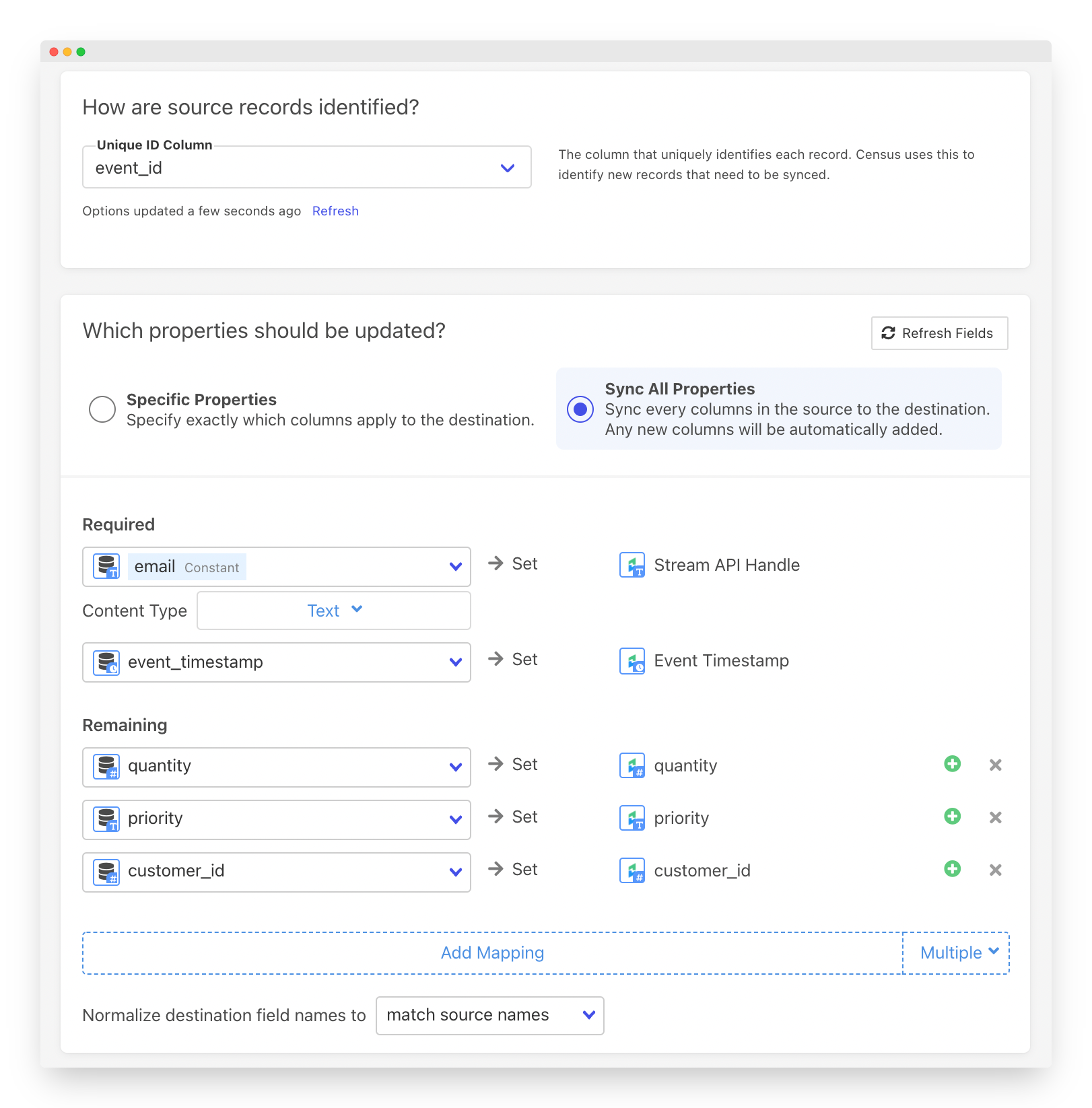 From there, you can add any fields you like. We'll use the "Sync All Properties" setting to automatically send every other column from our data source to the destination.