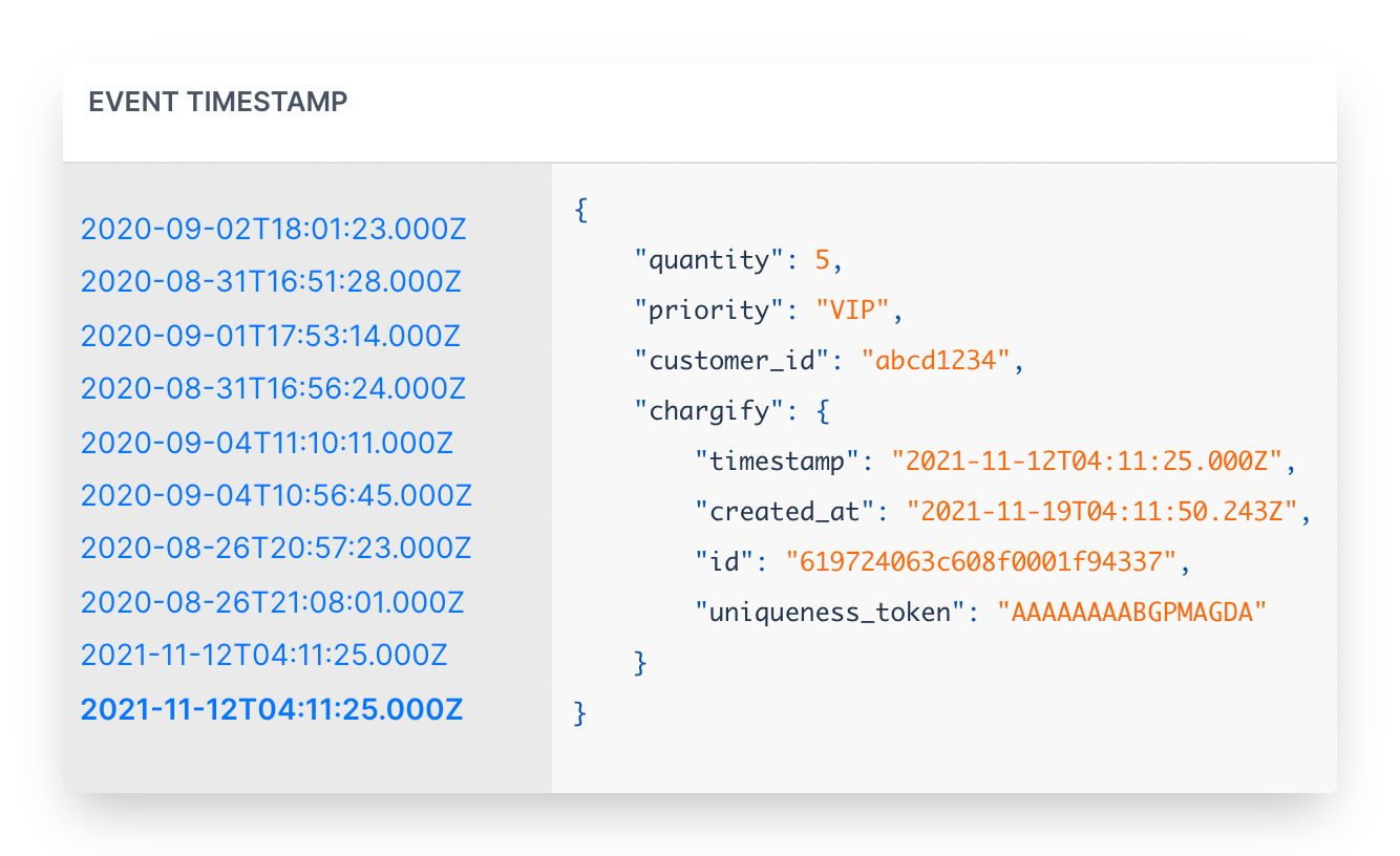 Now go back to Chargify, visit Events, Streams, and click on the stream you targeted. If everything well well, you should see your data!