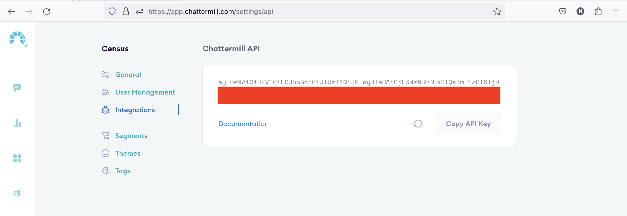 - Enter your API Token and Project Name. The former can be found in the Chattermill app under Settings > Integrations.