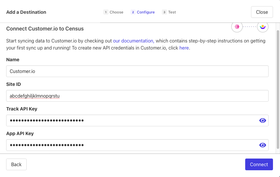 To connect Activations to your Customer.io, you'll need to provide Activations with a few credentials so that we can talk to it directly.