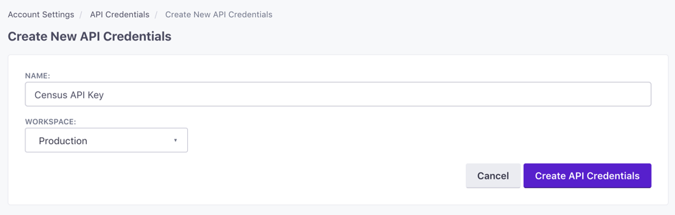 Then, give the new credentials a name. It can be whatever you like, but give it something memorable so you know this key is used by Activations. If you're using Customer.io's workspaces feature, you'll want to specify which workspace to use. If you want to connect Activations to multiple workspaces, you'll need to create credentials for each one.