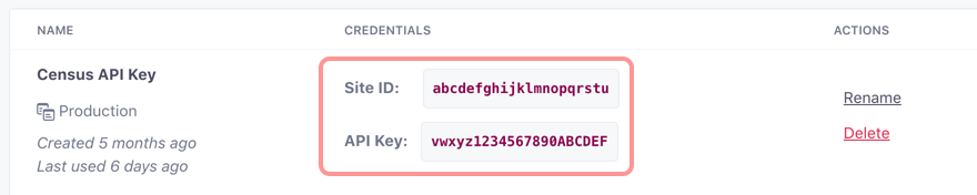 When you hit save, you'll return to the list of credentials. Make a note of the Site ID and API Key. You'll need to provide them to Activations.