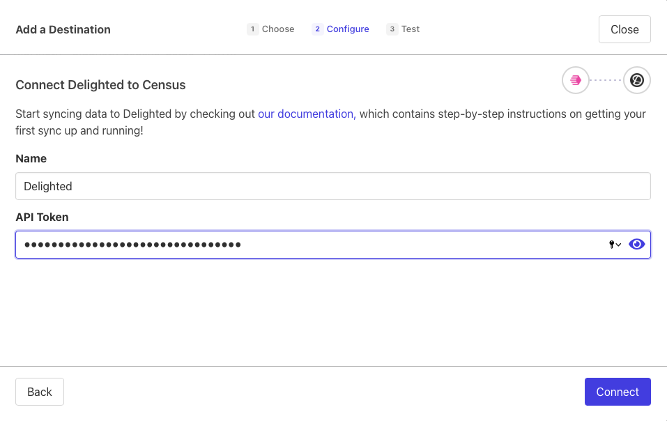 Next, you'll need your API Token from Delighted in order to connect. Your authentication flow should look like this:\