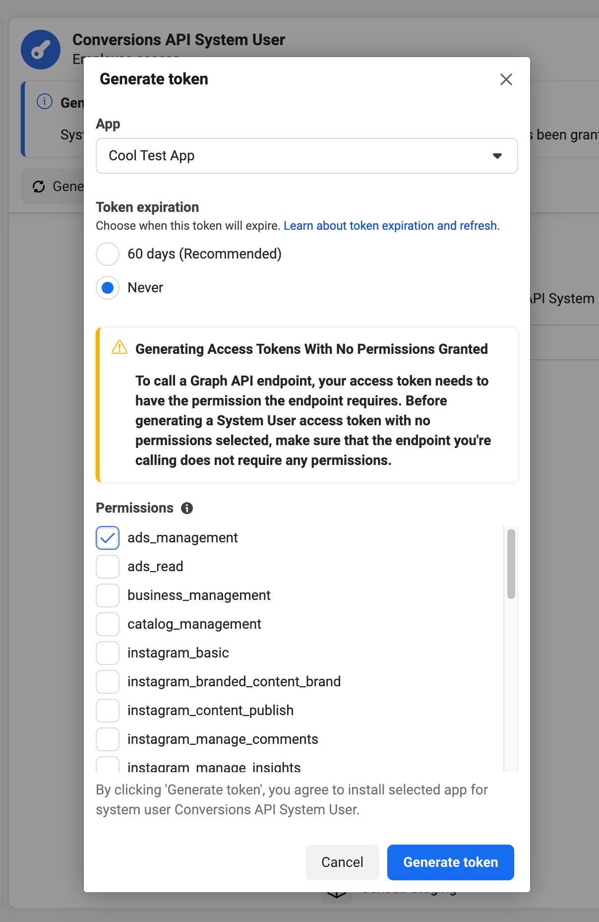 To validate that your System User Token is set up correctly and has the necessary scopes you can input your access token in the link below.