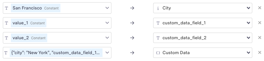 The Custom Data mapping above is: {"city": "New York", "custom_data_field_1": "value_3"} .