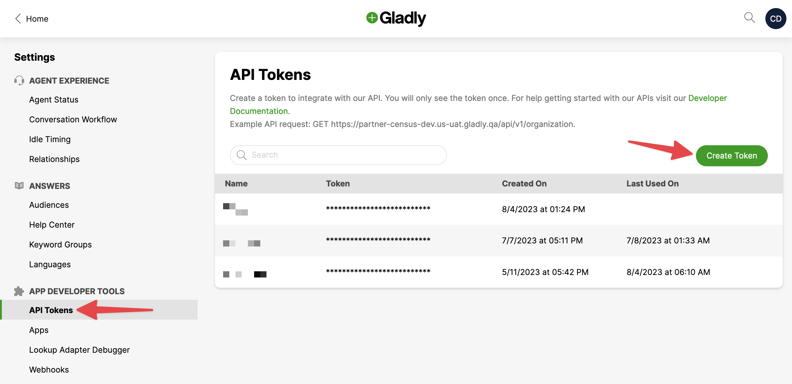 - Open Gladly in another browser tab and navigate to Settings > API Tokens. Create a new token and copy it to your clipboard.