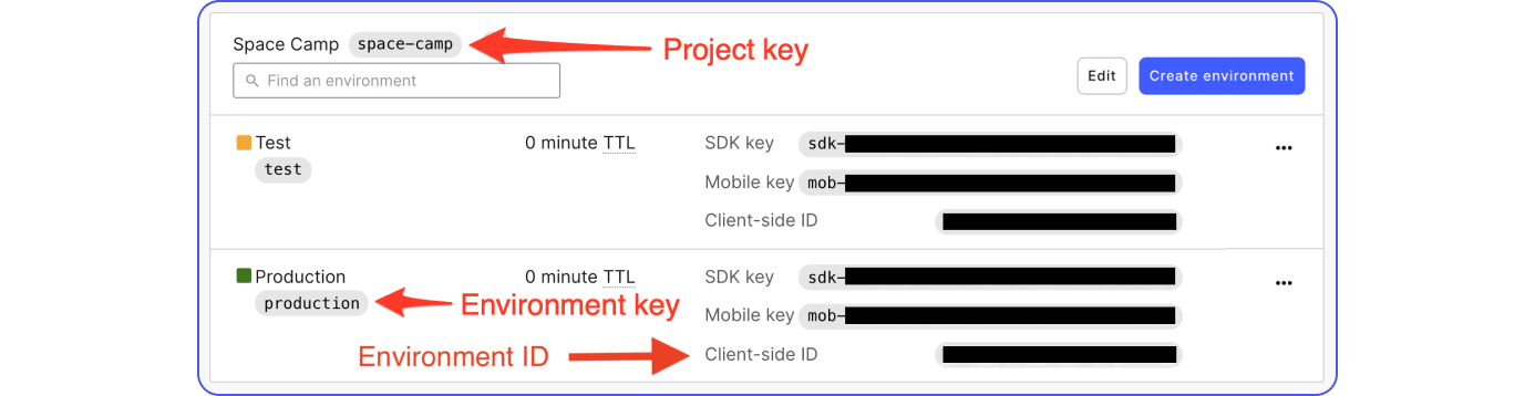 Go to Account settings > Projects and copy the Project Key, Environment Key, and Environment ID (LaunchDarkly uses Environment ID and Client-side ID interchangeably) as shown in the screenshot below. You will need to create separate Environment Keys for each Environment you wish to sync to.