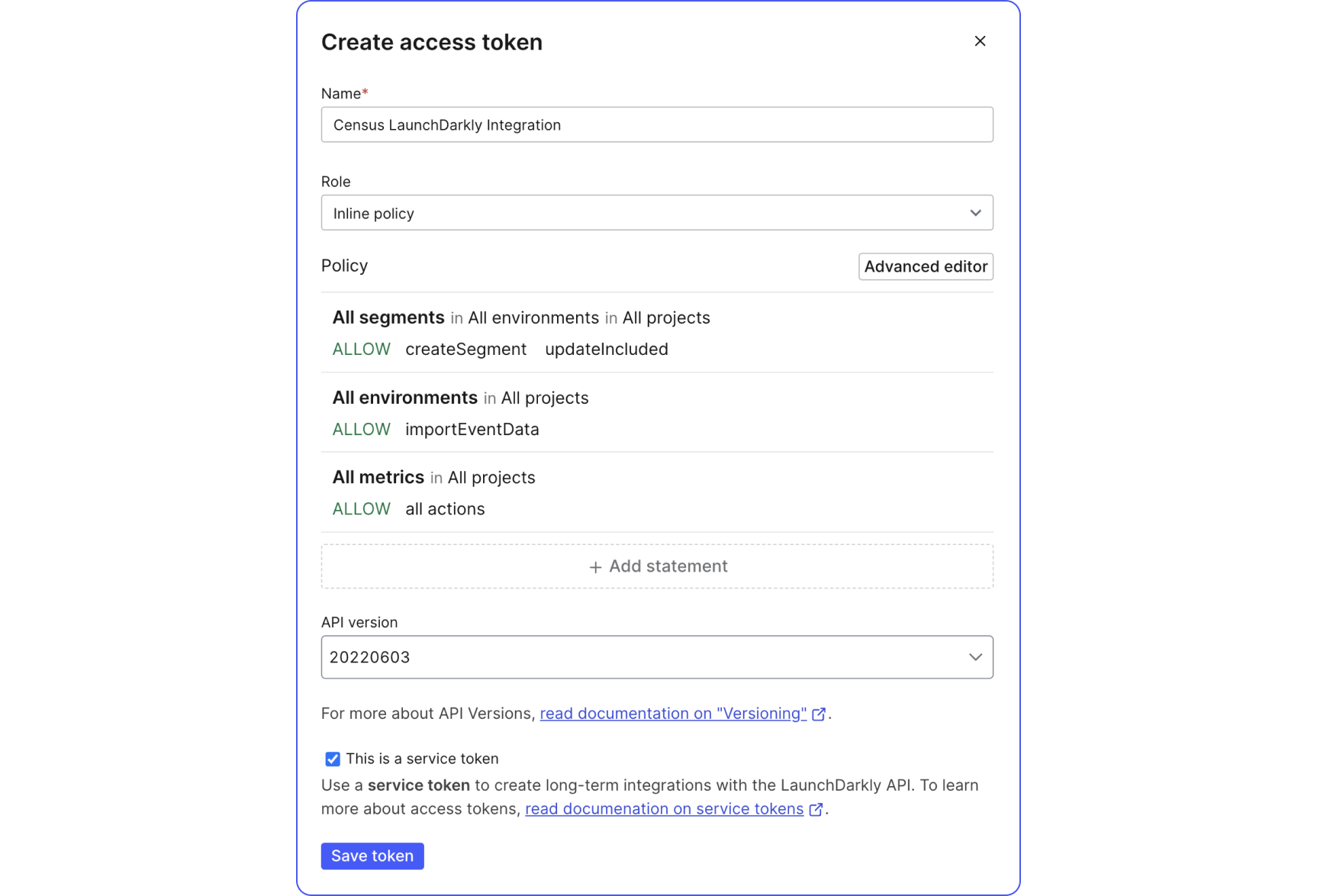- Check the box next to This is a service token. You can leave the API version set to the default value.