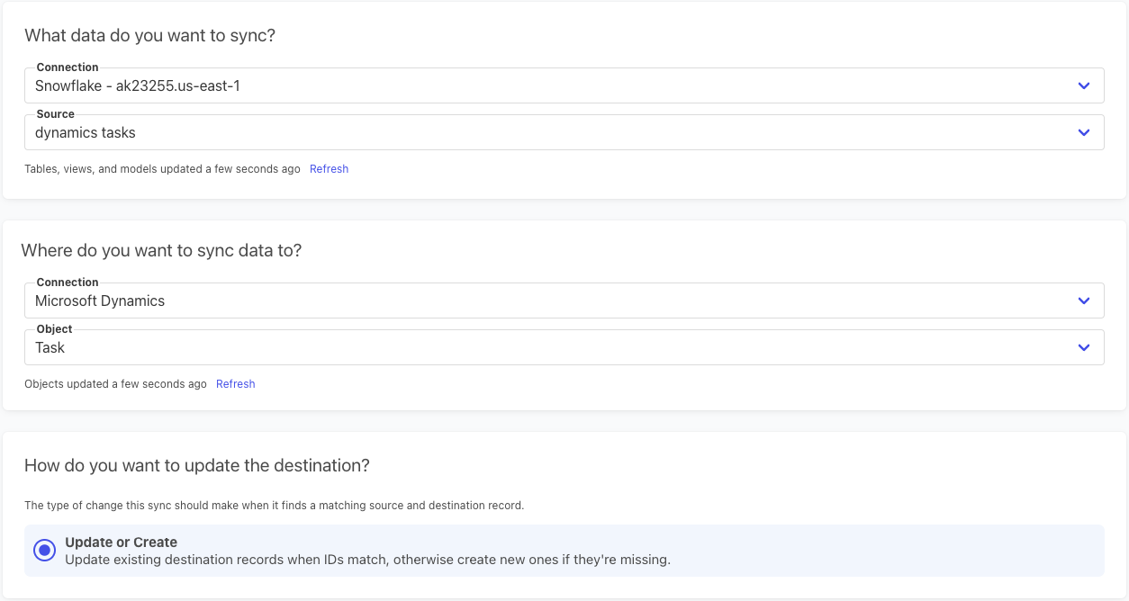 - Under How should changes to the source be synced?, choose Update or Create (see Supported sync behaviors for options)