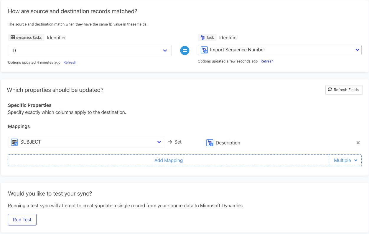 - Under How are source and destination records matched?, select an Identifier for the model and for the Microsoft Dynamics object. Valid identifiers are single-columns keys for entities that you can set up in your Microsoft Dynamics instance (see Supported objects for more detail).