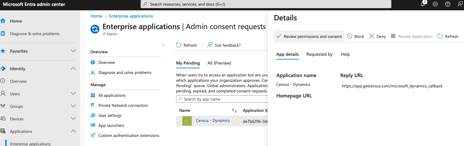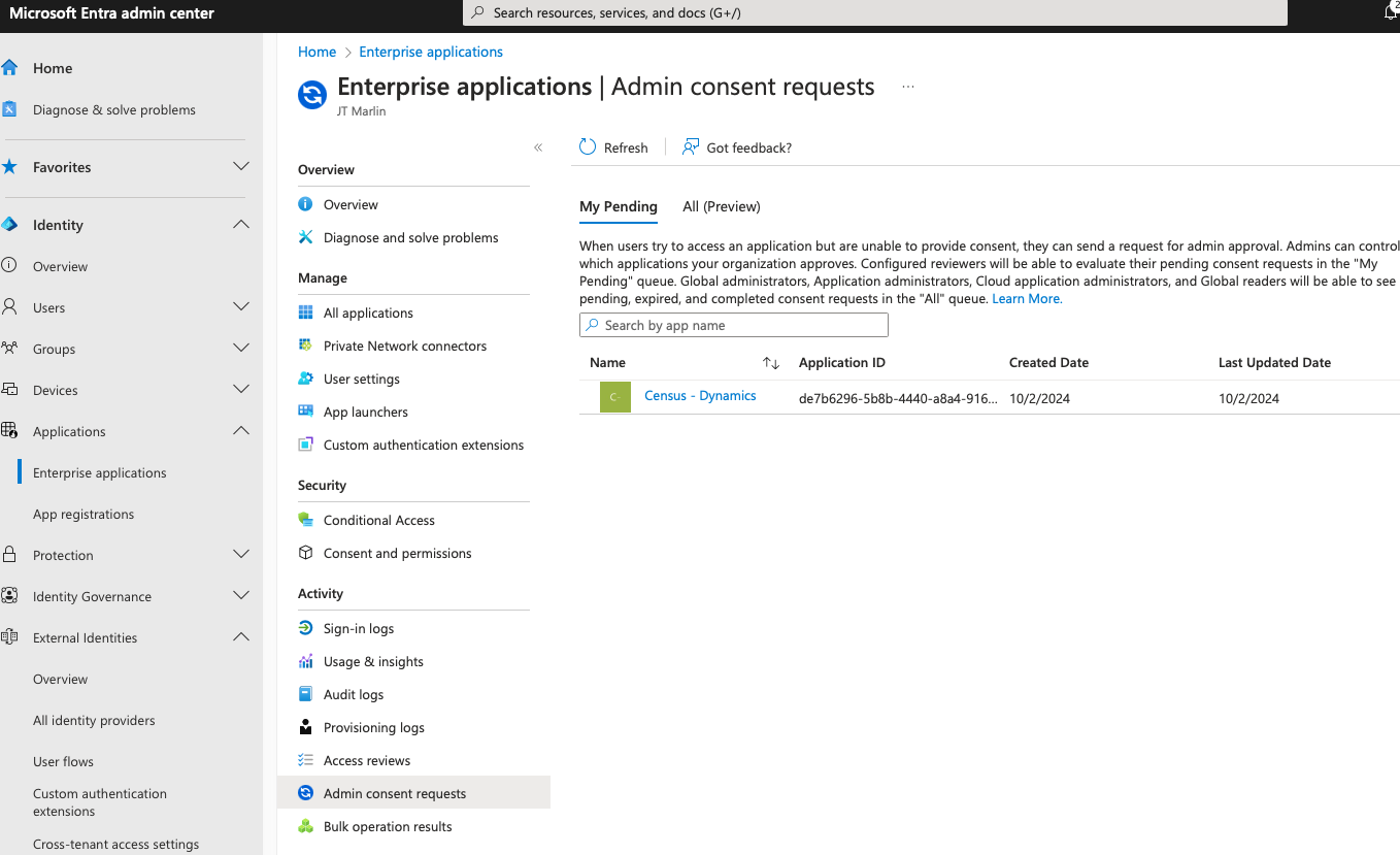 To use Activations with Dynamics, your Dynamics user must be able to request to request admin approval for apps. The following will walk you through the approval workflow in Microsoft Entra.