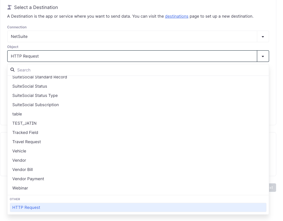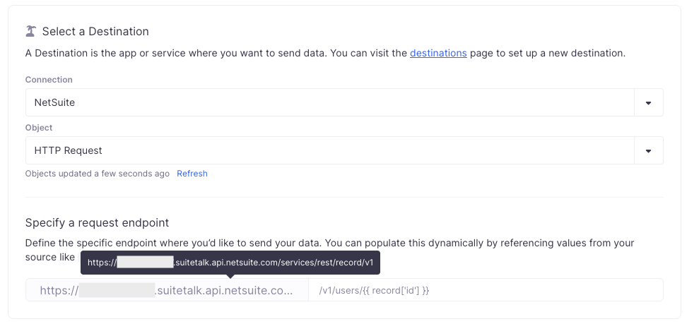 - Configure the rest of the sync as you would for a general HTTP Request destination, and we'll use your existing NetSuite credentials under the hood.