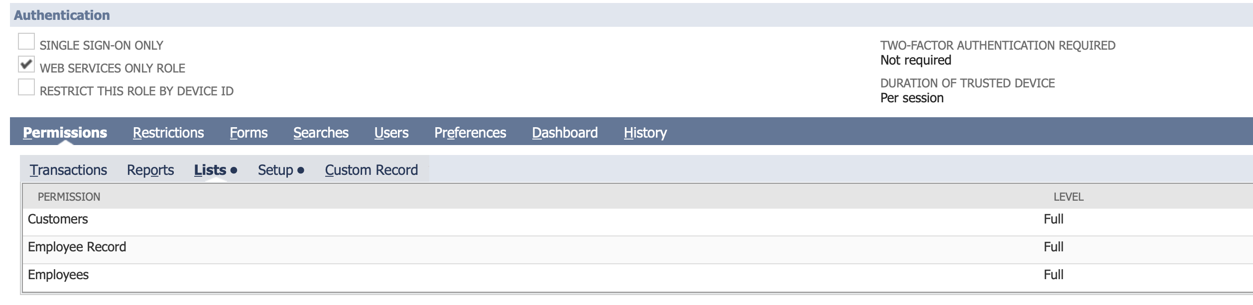 7. Under Permissions > Lists, Give your Role the appropriate permissions for the NetSuite objects you'll be updating. For example, to update Customers, you'll want to give this role the Lists > Customers (Full) permission.