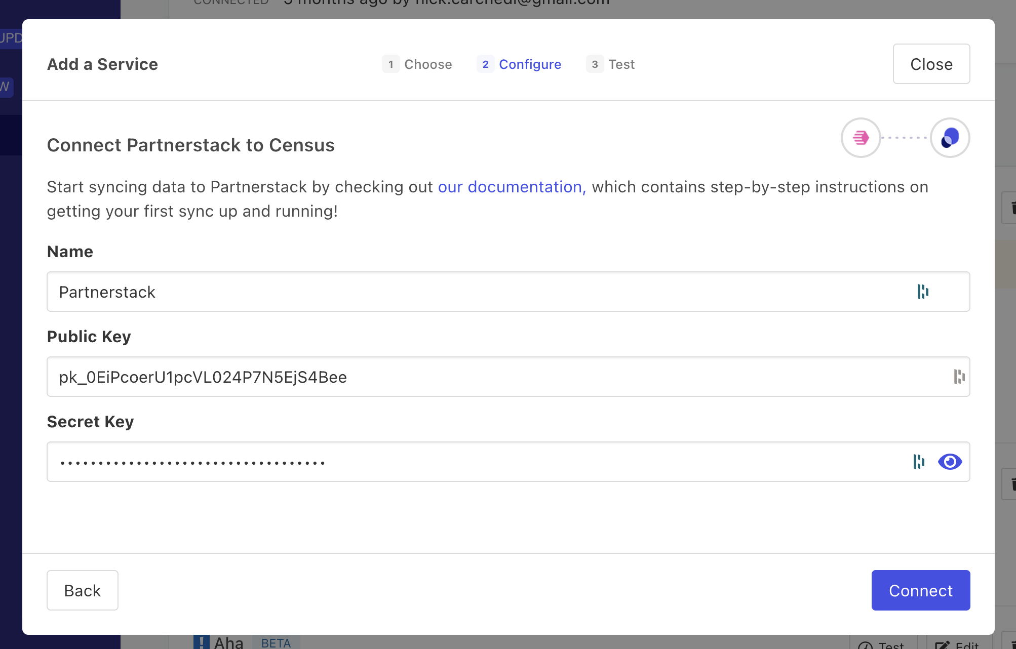 - Open the PartnerStack app in another window. Go to Settings > Integrations and copy the relevant API keys (either Test or Production).