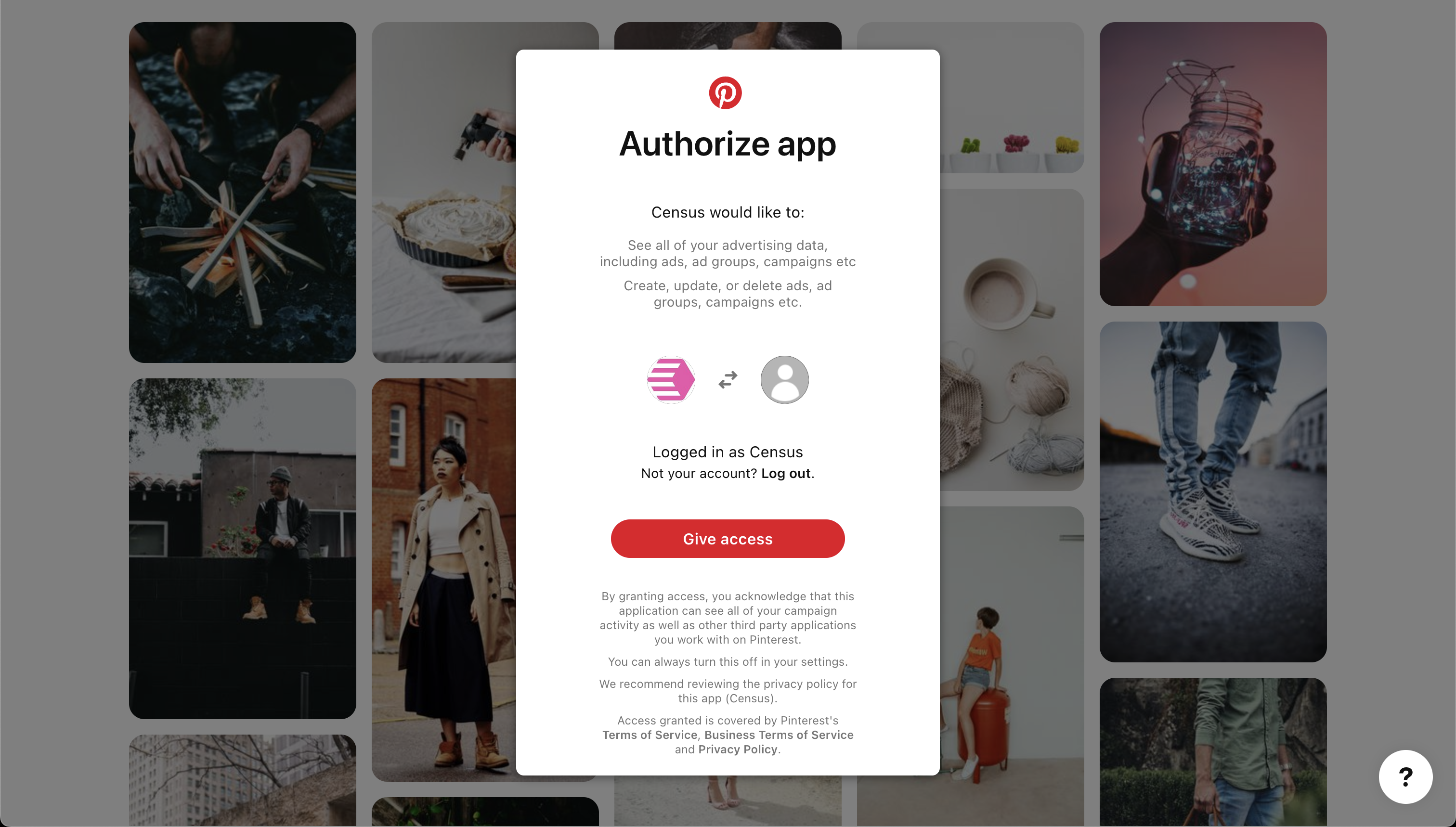 Note: You will need admin rights in your organization's Pinterest Business Account to be able to successfully authenticate the connection.