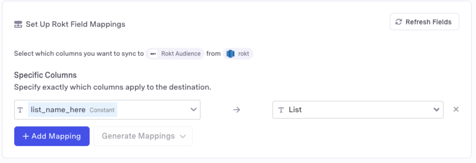 To specify the list to which you want to add members, its name has to be mapped to the List field in Rokt. This means it should either be available in the source, or set as a Constant Value.