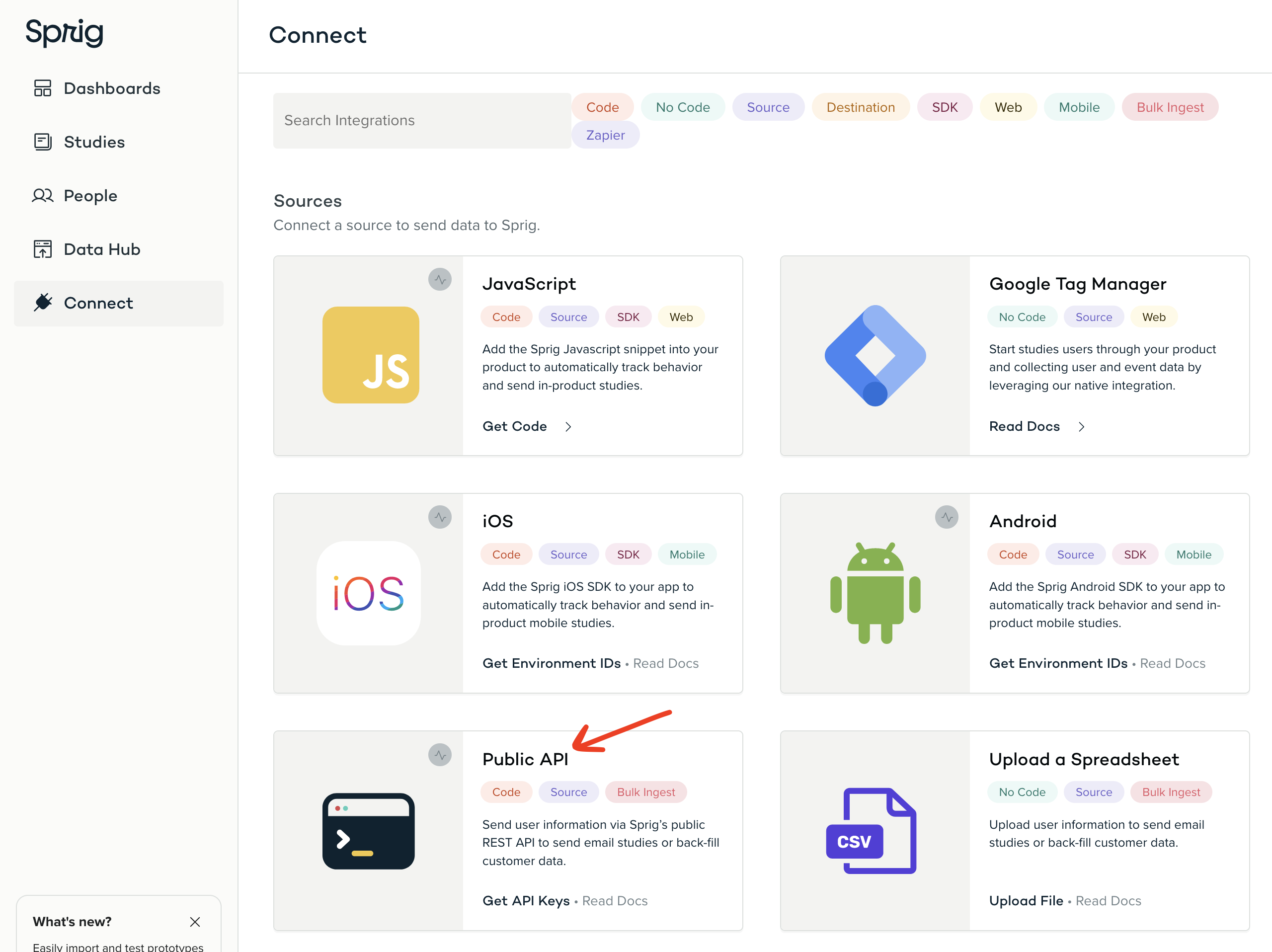 - Open the Sprig app in another window. Go to the Connect page and select Public API. Then copy the relevant API key (either production or development).