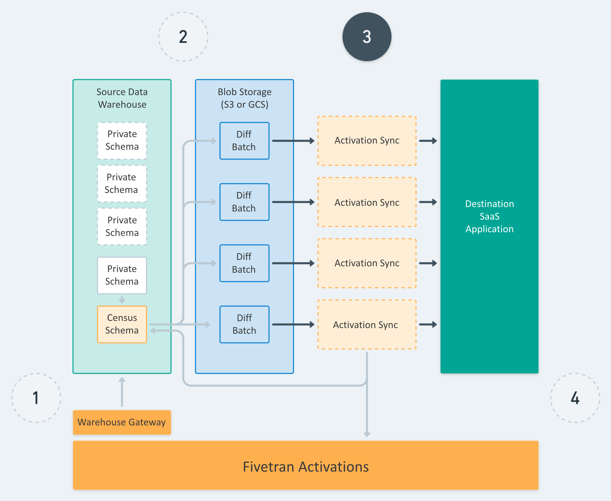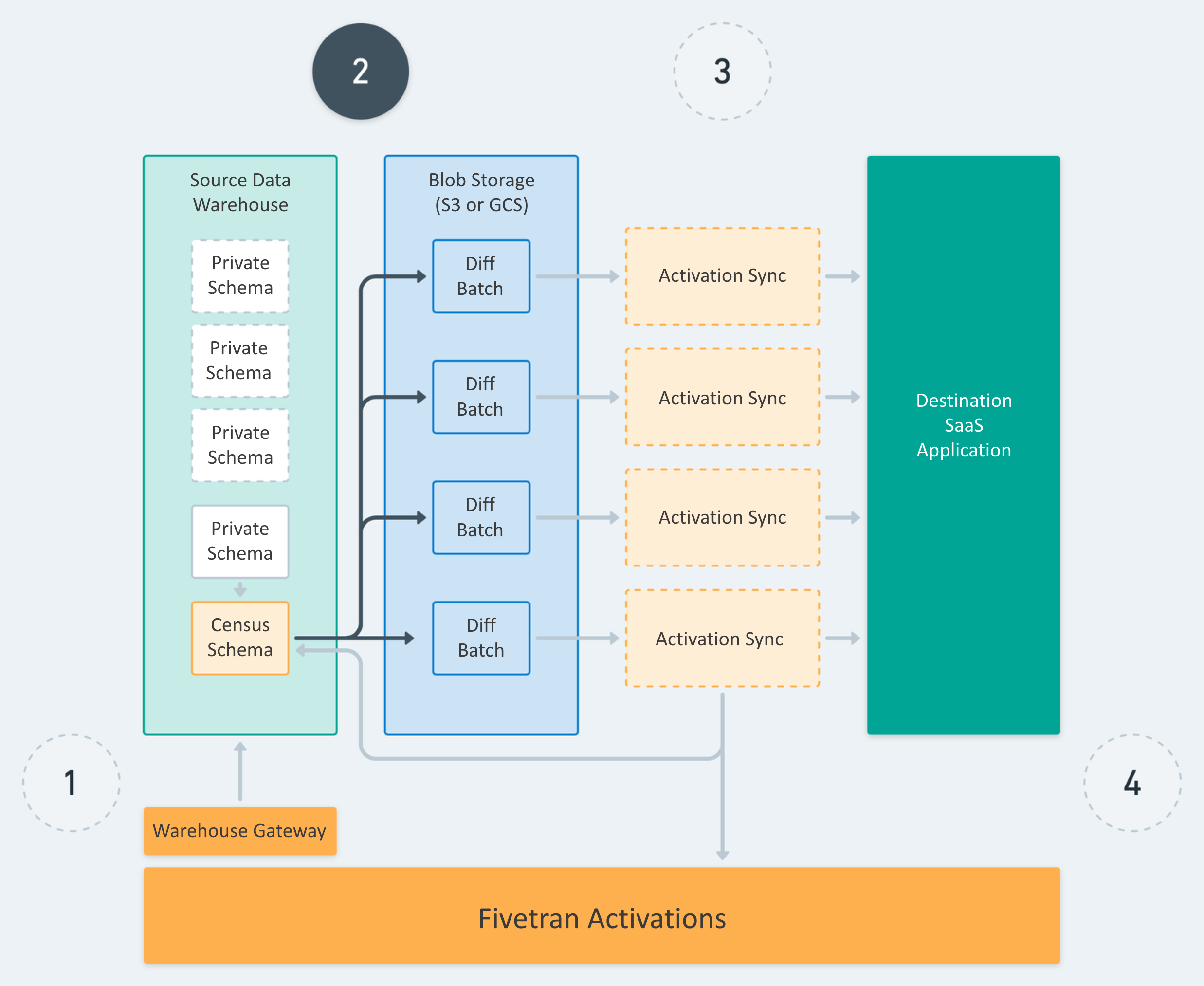 It’s impossible for Fivetran to read data from your warehouse that you don’t explicitly opt-in, and if you choose you can even set up fine-grained table-level access for the Activations user. When a new sync starts, Fivetran looks for rows of data that have been added or changed since the last sync, and records a temporary snapshot of those rows in the Census schema.