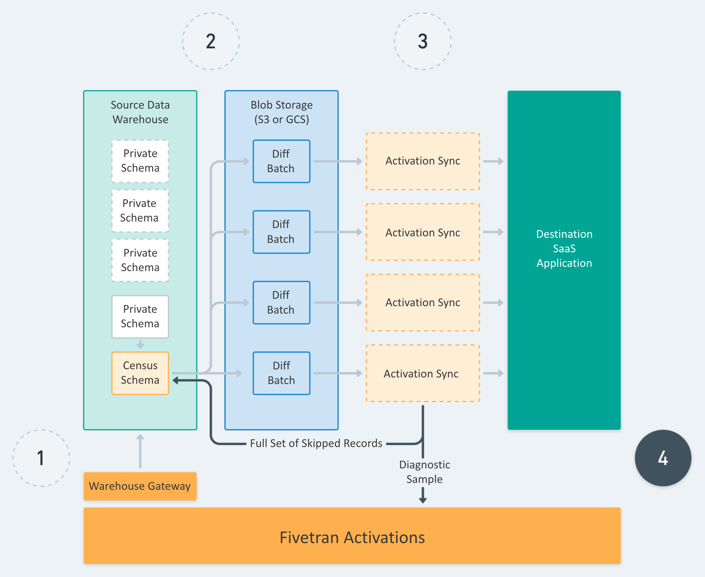 The list of records that failed is written directly back to the Census schema in your data warehouse, and a small sample of those failures (no more than 100) are captured and sent to the Activations platform. These diagnostic samples are the only customer data that will ever be stored in Fivetran, and their storage is limited to 7 days.