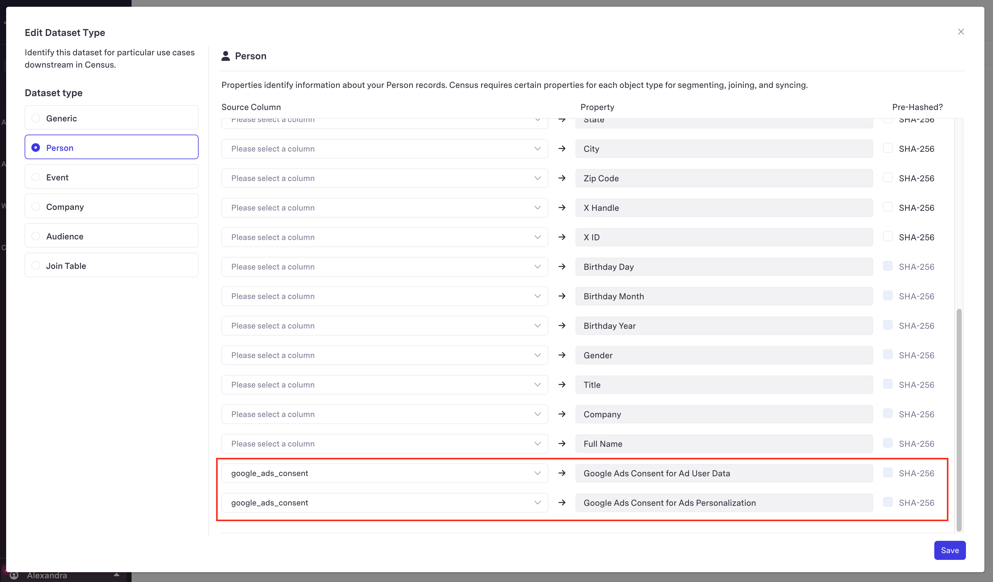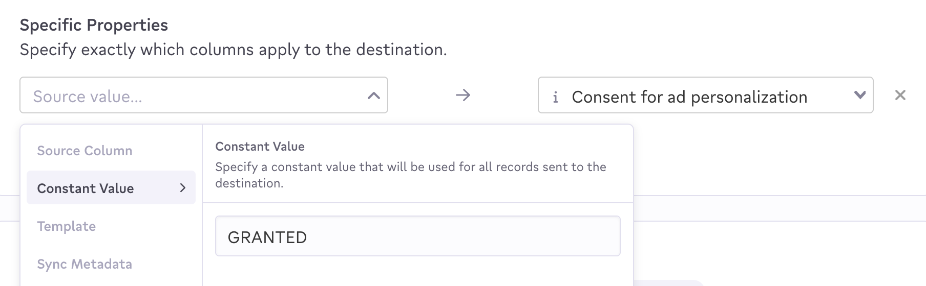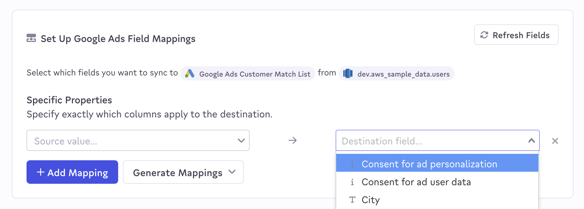 Add two additional mappings—1) Google Ads Consent for Ad Personalization and 2) Google Ads Consent for Ad User Data—and select the relevant fields in your source data. Acceptable values for these fields are: