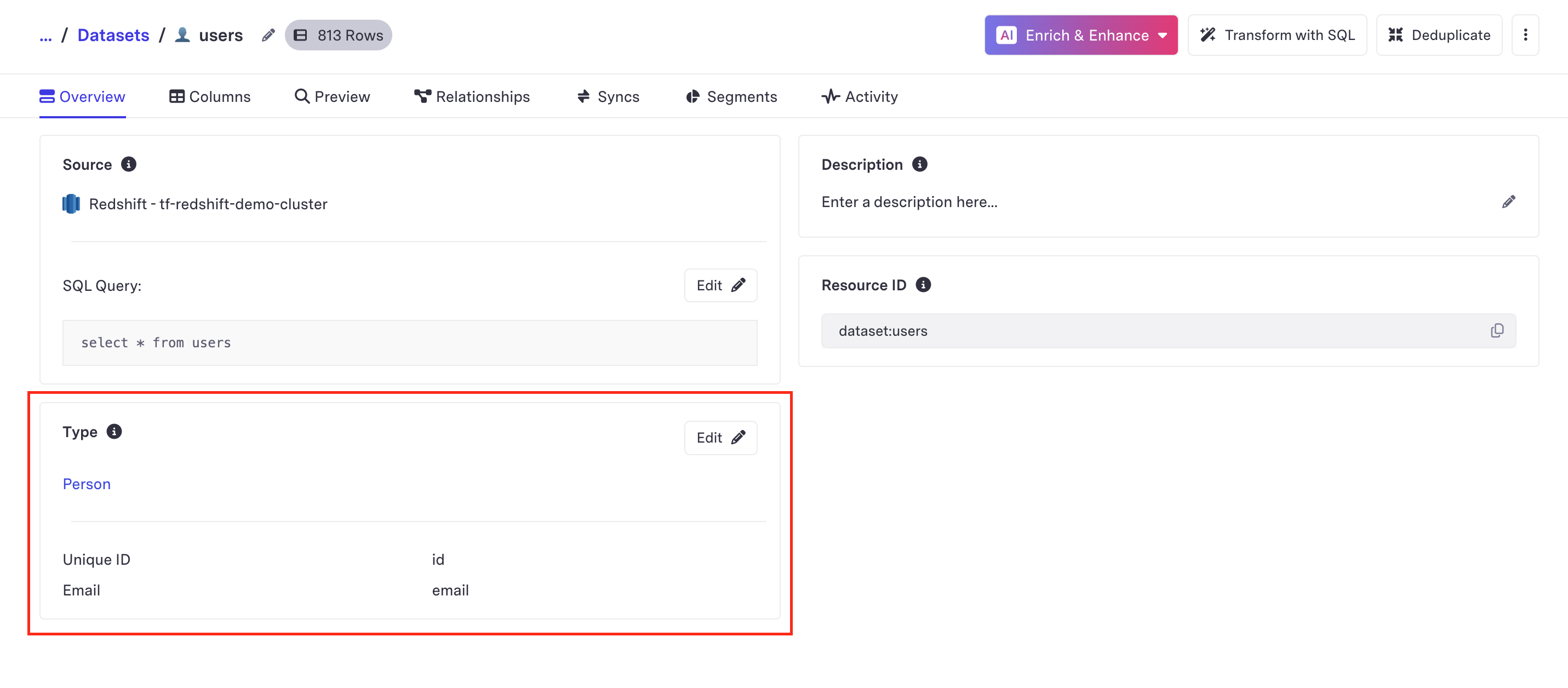 Click on the “Person” dataset powering your one-click syncs. Look for the “Type” properties in the “Overview” tab and click “Edit”