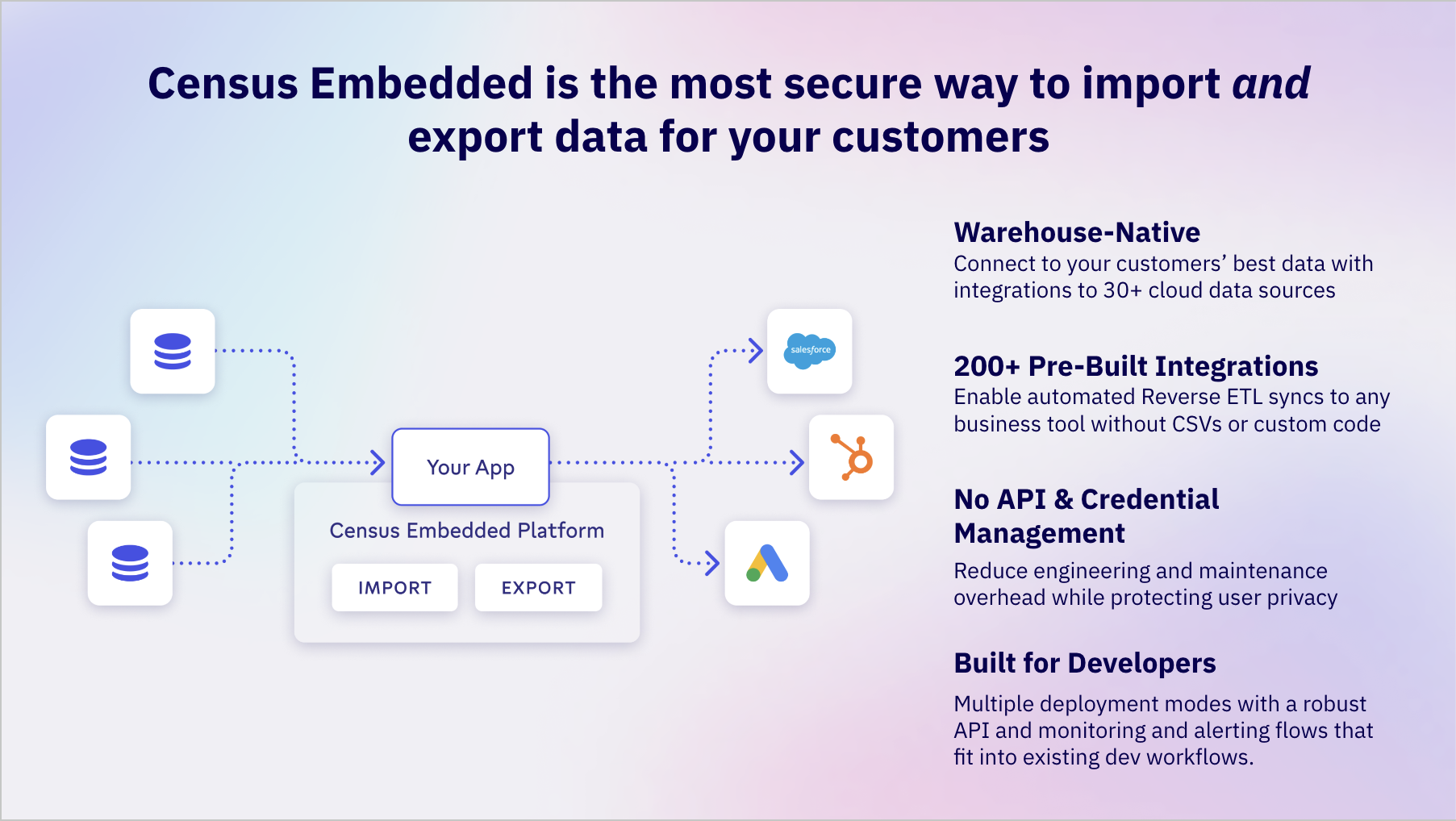 Unleash Your Data's Potential: Seamlessly push your data into the tools your customers use daily. No more CSVs or hacky import scripts. Increase your data's value to your customers by syncing it into over 200 business applications, including CRMs and marketing platforms with one simple integration.