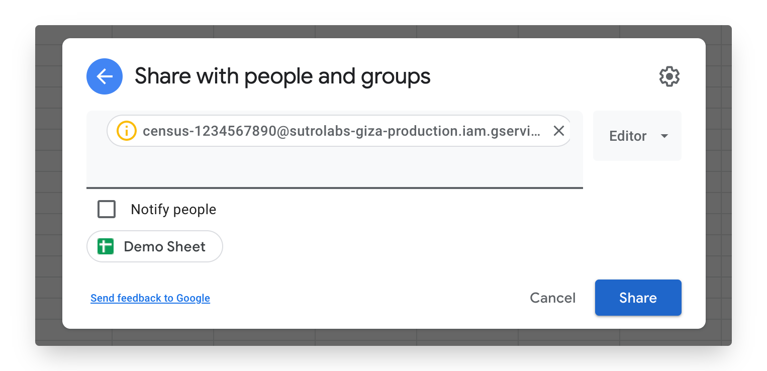 6. Confirm you do want to share and you're done! You can now use that sheet create a sync using that connection.