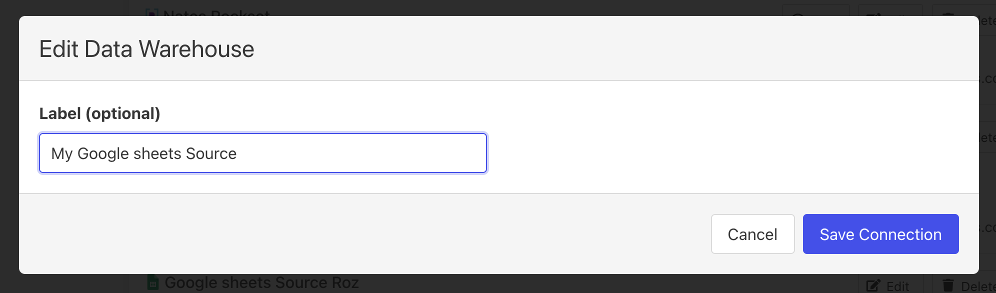 5. Give your Google sheets connection a unique name by clicking Edit and adding a label