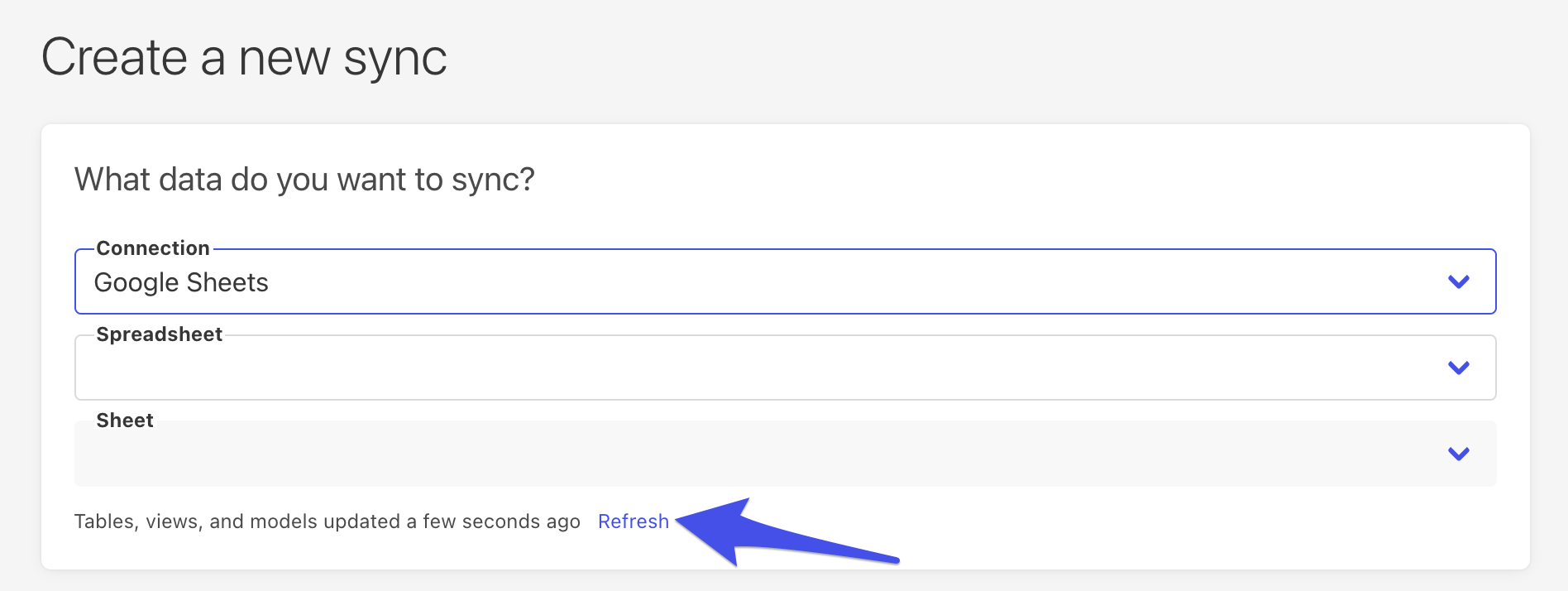 - Important: If this is your first time connecting a Google Sheet, it won't show up under the 'Spreadsheets' dropdown. You will need to click Refresh in order to load the Google Sheets that you shared with this connection (from the previous section).