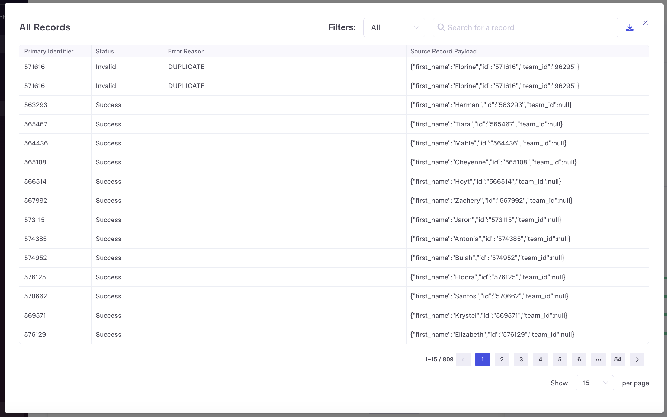 | record_payload | The full record payload extracted from the source as a JSON blob. This is not 1:1 with the data sent to the destination as this data can be conditional applied to the destination |
