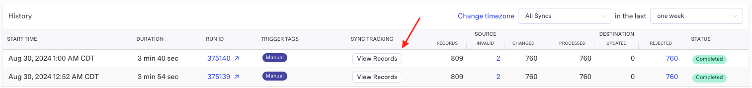 To use Sync Tracking, navigate to the Sync History page on the relevant sync. If a sync run falls within the 14-day retention period, a "View Records" button will be available. Click this button to open up the Sync Tracking modal and access detailed record information.