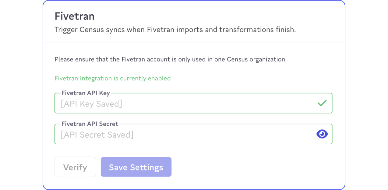 - Copy and paste your Fivetran API Key and Secret. Press Verify to confirm they were copied correctly and have the correct permissions. Save your settings.
