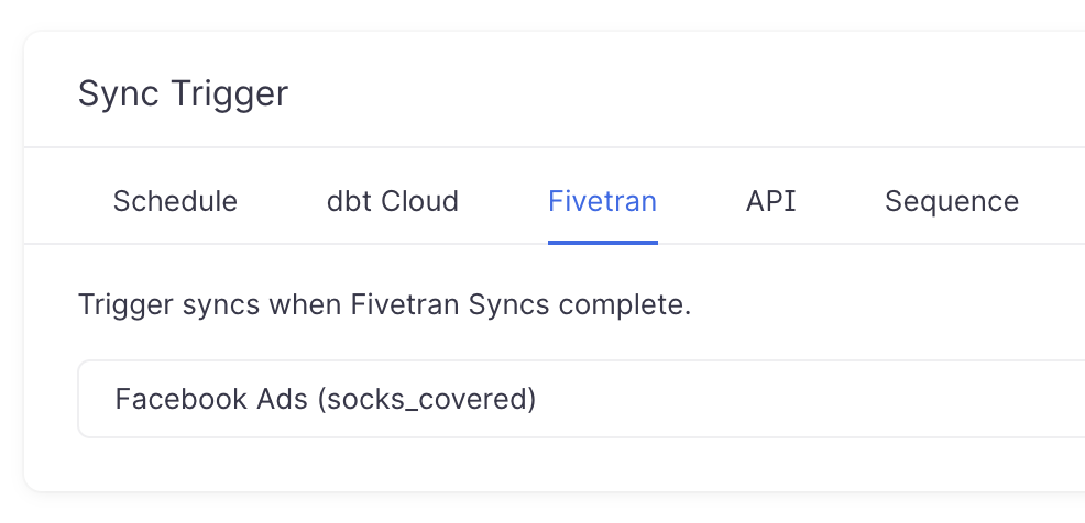 You can trigger activation syncs based on upstream activity from both other activation syncs as well as the rest of Fivetran's connections and transformations. If your syncs have dependencies and you'd like to organize them to run in order, you can use a Sequence, which runs a dependent sync whenever its specified parent sync completes successfully. On the sync configuration page, activation syncs appear in the Sequences tab, while Fivetran connections and transformations appear in the Fivetran tab.