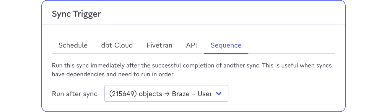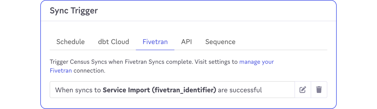 If you use Fivetran to load data into your data warehouse, or make use of their data transformations, you can trigger activation syncs to run once that work has completed.
