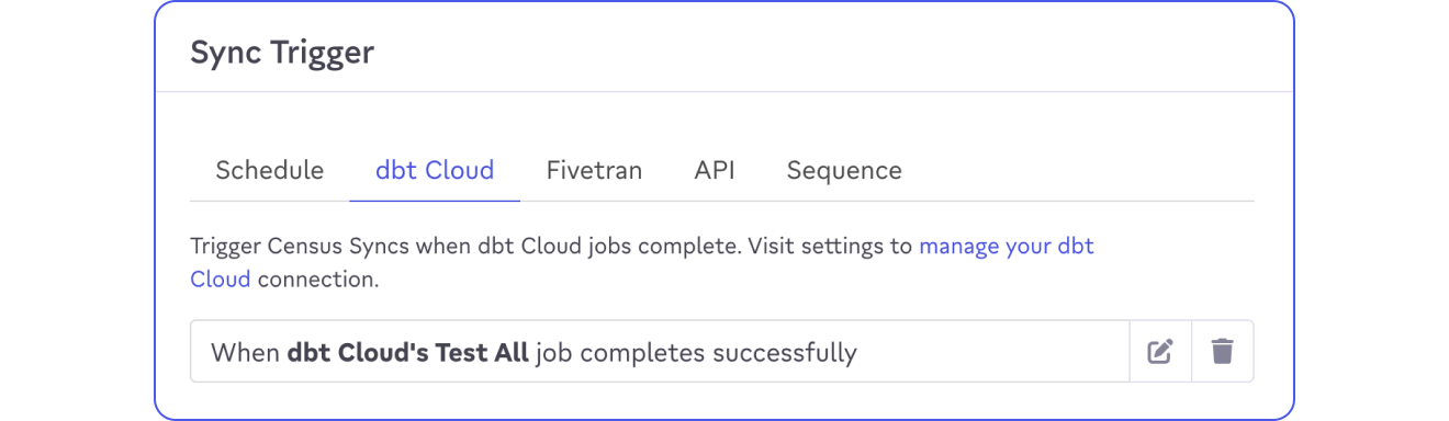 If you're using dbt Cloud to compile your dbt project, Activations can trigger syncs whenever one of your dbt Cloud project runs have completed. Simply select your dbt Cloud project's job to monitor and Activations will automatically trigger a sync when it completes.