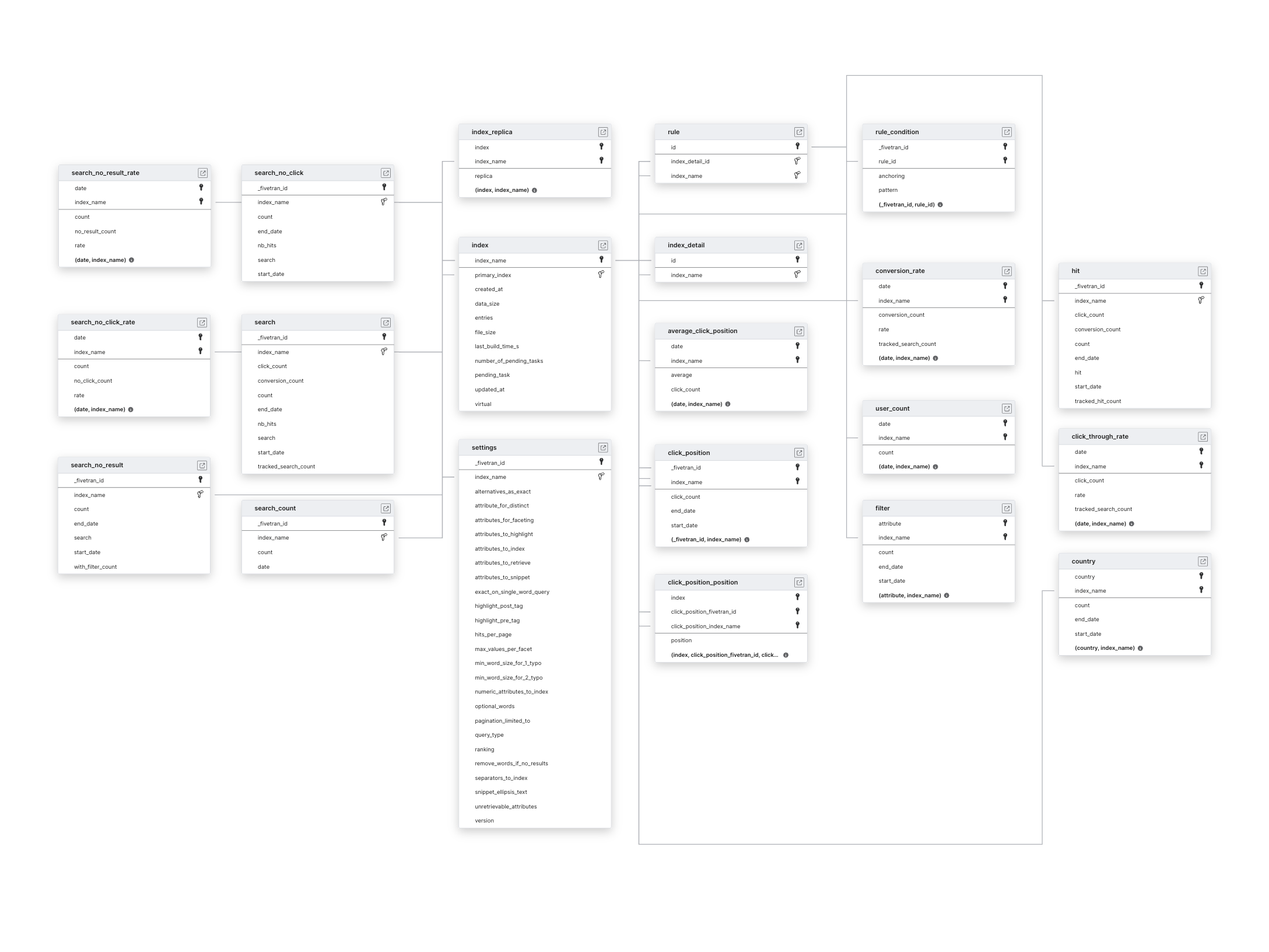 | Priority-first sync | check | AVERAGE_CLICK_POSITION, CLICK_POSITION, CLICK_THROUGH_RATE, CONVERSION_RATE, COUNTRY, FILTER, HIT, SEARCH, SEARCH_COUNT, SEARCH_NO_CLICK, SEARCH_NO_CLICK_RATE, SEARCH_NO_RESULT, SEARCH_NO_RESULT_RATE, and USER_COUNT tables. |