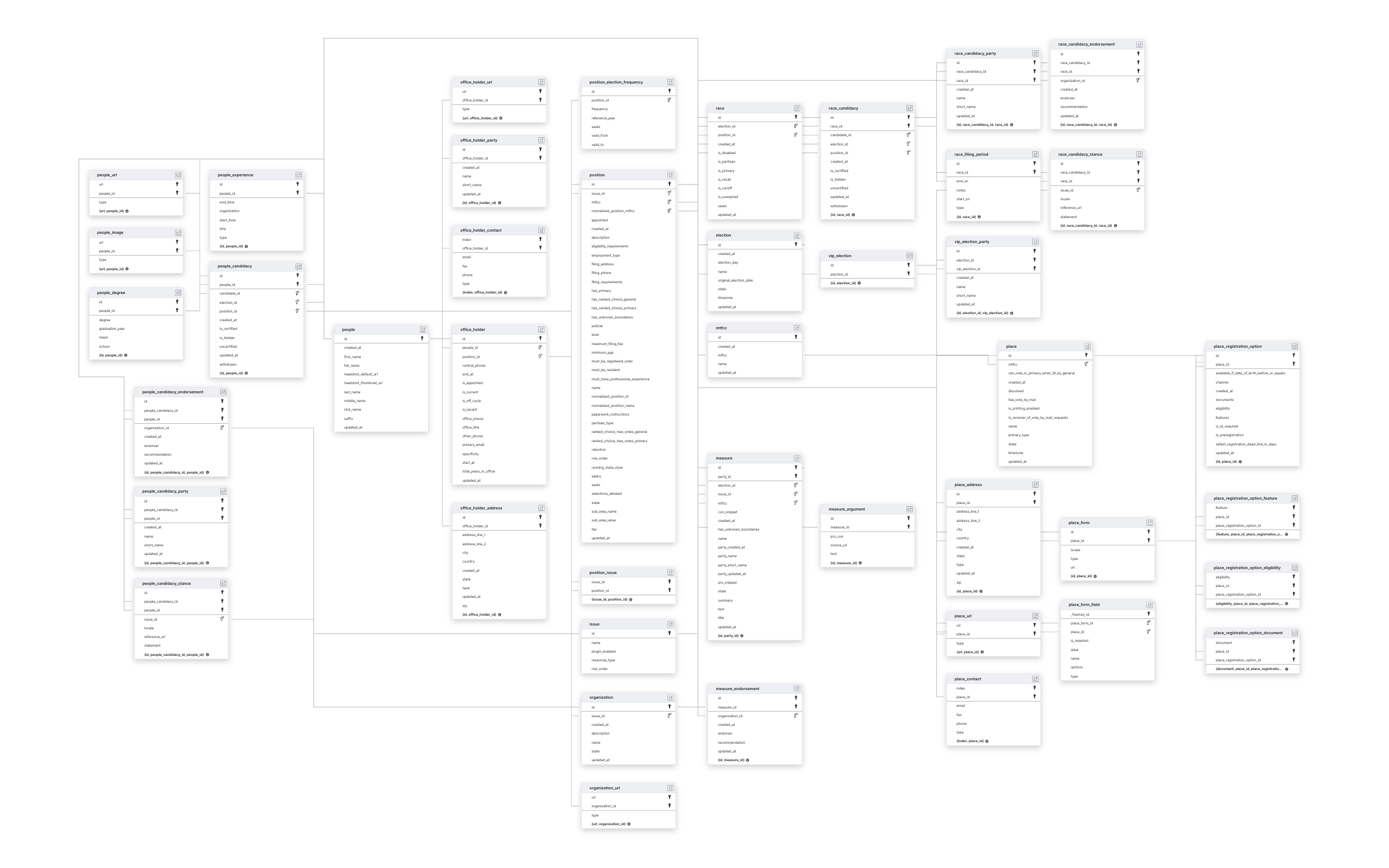 ELECTIONMEASUREMEASURE_ARGUMENTMEASURE_ENDORSEMENTOFFICE_HOLDEROFFICE_HOLDER_ADDRESSOFFICE_HOLDER_CONTACTOFFICE_HOLDER_PARTYOFFICE_HOLDER_URLPOSITIONPOSITION_ELECTION_FREQUENCYPOSITION_ISSUERACERACE_CANDIDACYRACE_FILING_PERIODVIP_ELECTIONVIP_ELECTION_PARTY