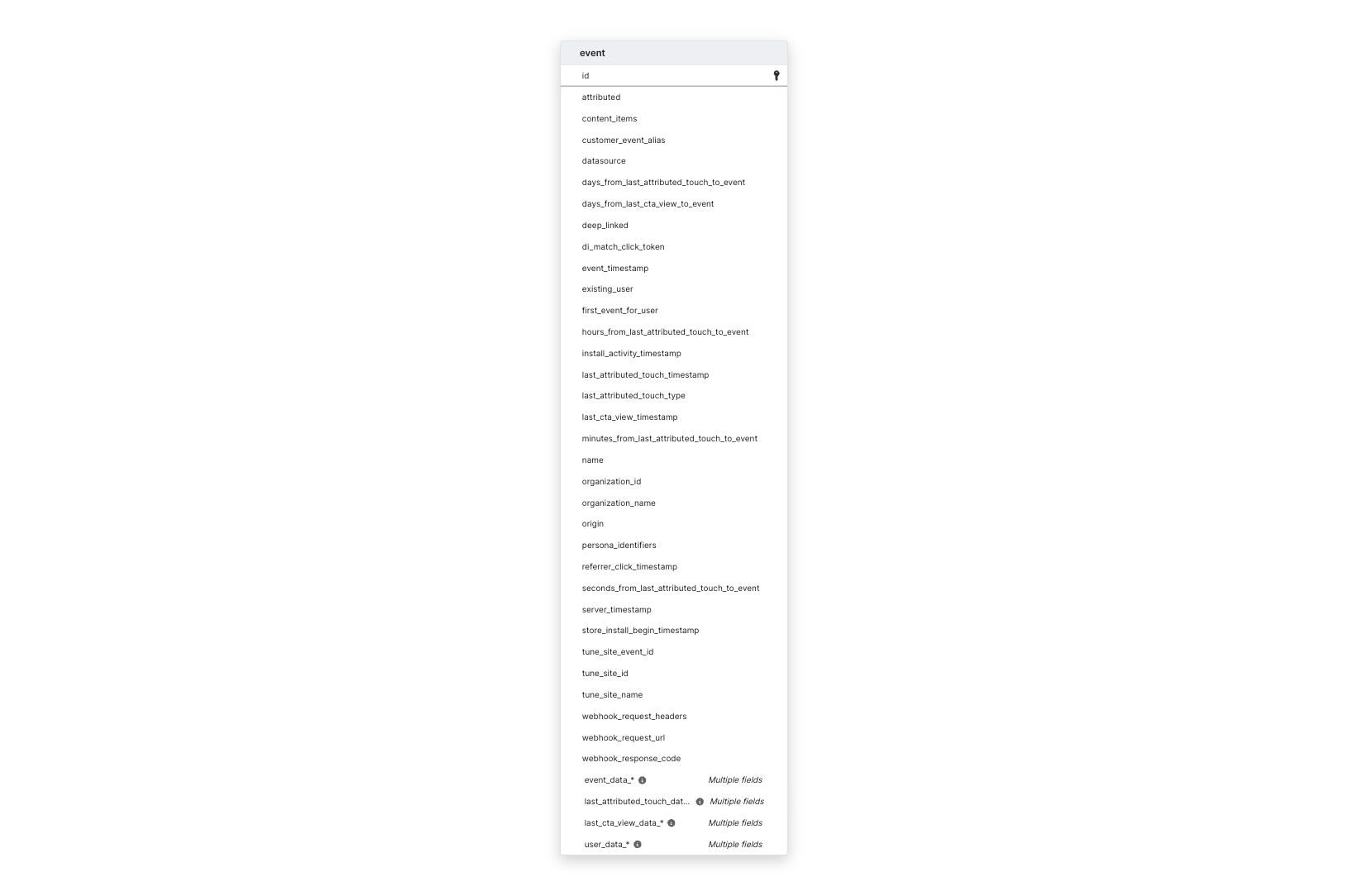 We sync the events using Branch's webhook system into a primary standard table, EVENT.