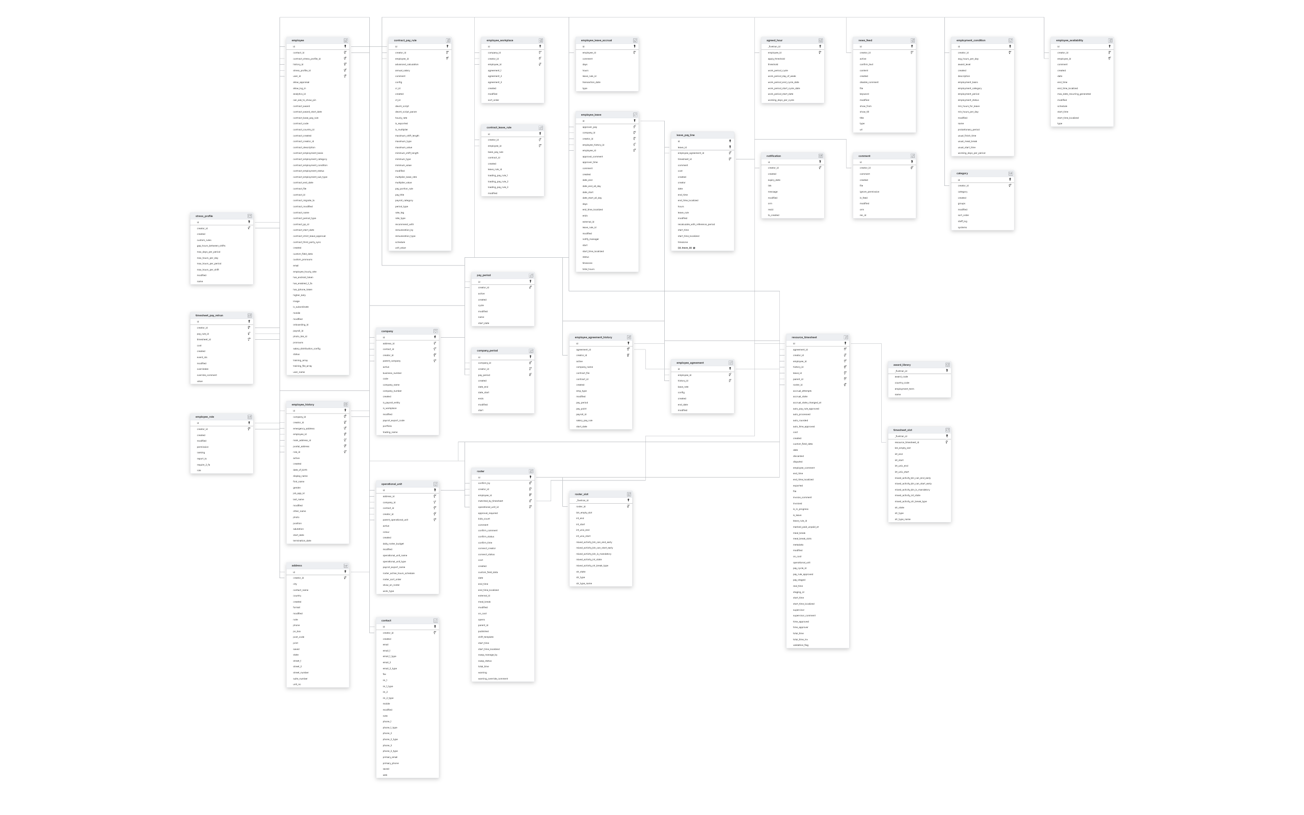 ADDRESSCATEGORYCOMMENTCOMPANYCOMPANY_PERIODCONTACTEMPLOYEEEMPLOYEE_AGREEMENTEMPLOYEE_AGREEMENT_HISTORYEMPLOYEE_AVAILABILITYEMPLOYEE_HISTORYEMPLOYEE_LEAVEEMPLOYEE_ROLEEMPLOYMENT_CONDITIONOPERATIONAL_UNITPAY_PERIODRESOURCE_TIMESHEETROSTERSTRESS_PROFILETIMESHEET_PAY_RETRUN