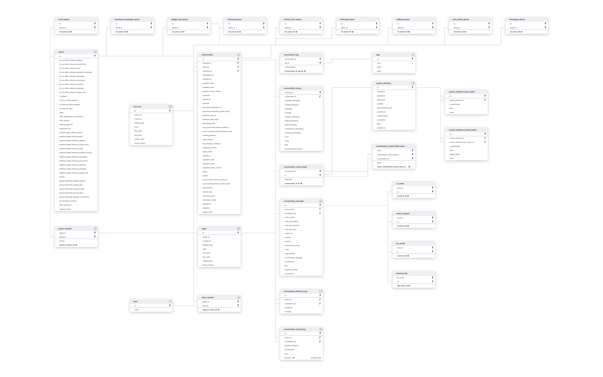 To capture new records, we incrementally sync the CONVERSATION, CONVERSATION_ACTIVITY_LOG, CONVERSATION_INTERNAL_NOTE, and CONVERSATION_MESSAGE tables and their child tables.
